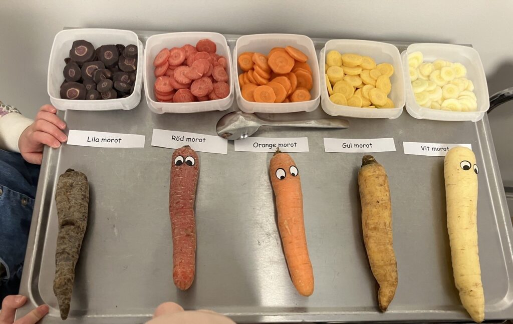 I arbetet med månadens gröna har turen nu kommit till moroten. Under veckan har barnen fått prova på olika sorters morötter och vi fick i samband med detta även möjlighet att samtala om olika färger. Barnen var modiga och vågade smaka och reflekterade över att morötterna smakade lite olika men att alla var goda, favoriten blev dock den röda med två tummar upp. Vi ska utveckla arbetet genom att ugnsbaka morötterna, hur smakar de då? Vi ska också samtala tillsammans och ta reda på vad barnen redan vet om moroten för att sedan bygga vidare på deras kunskaper.