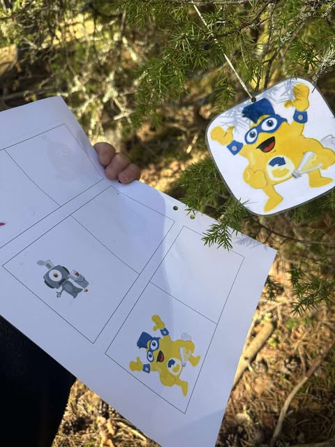 I och med den reviderade läroplanen för förskolan som kommit under hösten så har det blivit ett större fokus på rörelse och motorik. Vi vill utveckla detta på ett lekfullt sätt vilket resulterade i orientering i skogen tillsammans med barnen. Barnen fick i uppdrag att leda reda på olika Sopmonster och bakom varje bild fanns en geometrisk figur som barnen fick rita av på sitt eget papper. Det blev en lyckad aktivitet där barnen fick ta sig fram i skogen och öva sin motorik samtidigt som det skapade intresse och samtal kring de olika formerna och vad de heter.