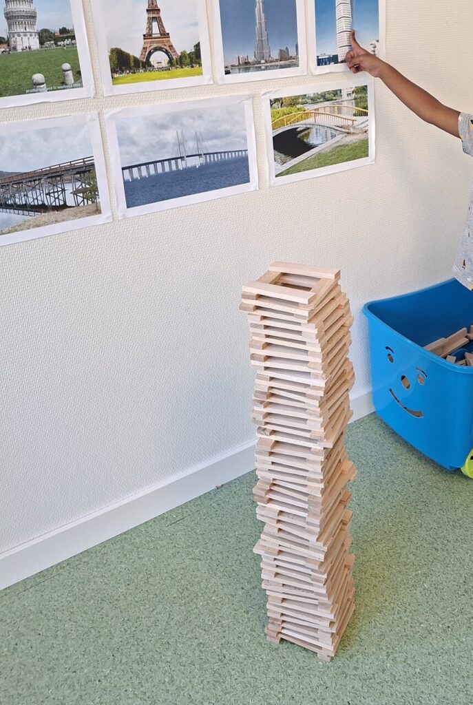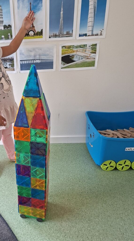Barnen visar stort intresse för konstruktion och bygger torn, hus och liknande med hjälp utav olika material. Vi har byggt upp en miljö med bilder som barnen tar inspiration ifrån i sina byggen. Ofta vill barnen att vi tar ett kort på deras byggen och vi dokumenterar som vanligt genom att placera bilderna på väggen. Där samlas barnen i samtal och vi upplever att det sker ett lärande genom både intressanta diskussioner kring och samarbeten i olika byggen.