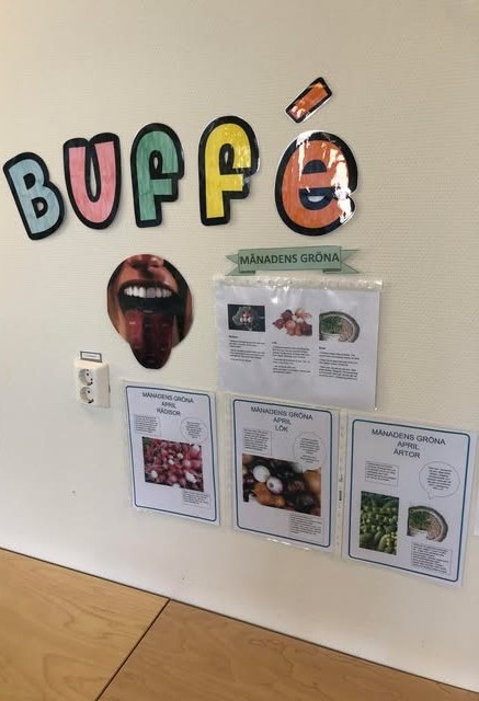 Månadens gröna är ett koncept som Karin arbetat fram, som syftar till att ha fokus på några grönsaker eller en frukter under en månad som står i centrum för måltiderna. Pedagogerna på förskolan arbetar även de med barnen kring månadens gröna där vi tillsammans beskriver smak, hur det känns och luktar samt tittar på hur den växer och kommer hela vägen till vår buffé. Barnen får också upptäcka månadens gröna med andra sinnen genom till exempel skapandeaktiviteter som potatistryck. Genom arbetet med månadens gröna får barnen möjlighet att prova nya grönsaker och frukter samt ökad kunskap om det vi äter.