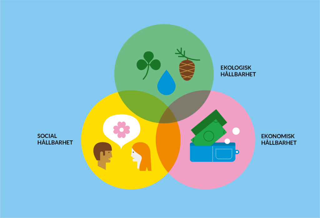 Vi på Blomsterängens förskola arbetar på ett sätt som inte äventyrar framtiden för kommande generationer. Därför är det viktigt för oss att den hållbara utvecklingen också genomsyrar hela vår verksamhet. Hållbar utveckling består av tre delar: